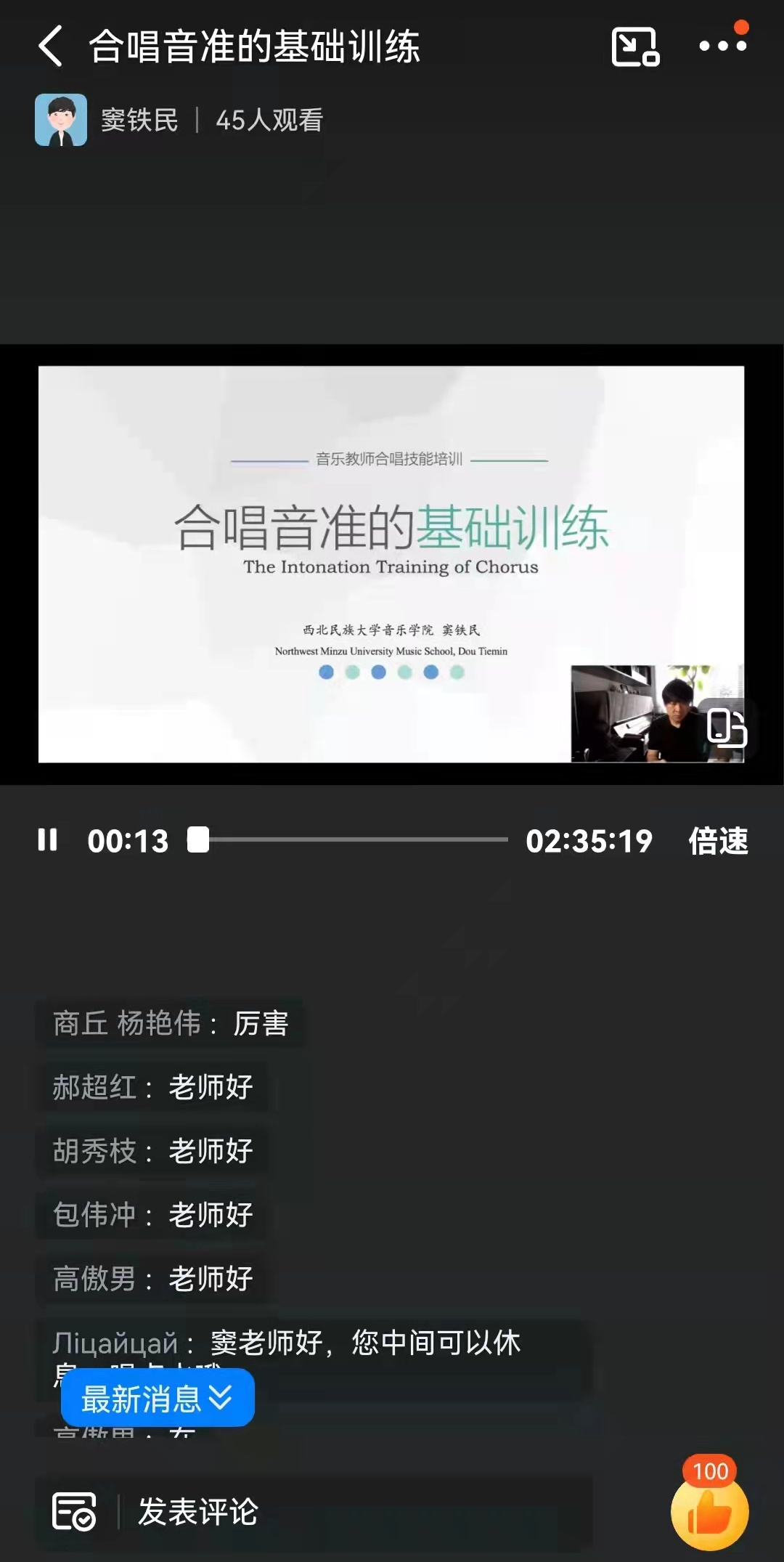 6月3日,应金年会金字招牌诚信至上之邀,西北民族大学音乐学院青年指挥家窦铁民为国培计划——县级骨干教师提升培训小学音乐教师培训班学员讲授《合唱音准的基础性训练》。由于疫情防控,本次采用线上授课。